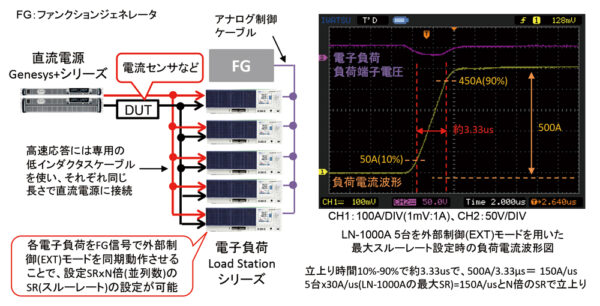 複数の電子負荷を外部制御(EXT)モードと用いて同期運転させることで、大電流で高速電流応答が可能です。汎用電源機器との組合せは、本アプリケーション用途以外にも、直流電源、電子負荷として使用することができ、遊休設備とせず必要時期に応じて使用することができます。