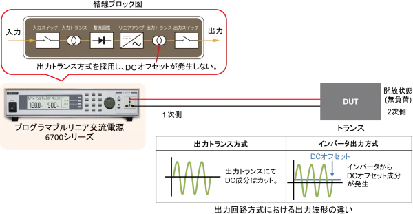 トランスの励磁電流は、1次巻線と2次巻線を磁気結合するために、1次側に必ず流れなければならない電流であり、2次側が開放(無負荷)の状態で1次側に流れる電流です。一般的に励磁電流の大きさは、トランスの電流容量の1/100程度と言われております。トランスの誘導耐電圧試験において交流電源を用いて試験するケースがありますが、交流電源の出力回路方式において、出力にDCオフセットが発生してしまう方式がある為、励磁電流が正しく流れずに試験できないことがあります。弊社交流電源6700シリーズは出力トランス方式を採用し、出力にDCオフセットが発生しない為、トランスの誘導耐電圧試験に最適です。