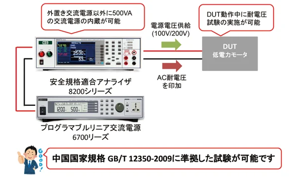 供試製品(DUT)へ通電中に耐電圧試験可能な安全試験器