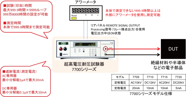 固体絶縁の破壊電圧は、電圧印加時間とともに低下するという現象(V-t特性)は、古くから知れており、試験に使用されるV-t試験器は印加電圧(V)と絶縁破壊の起きる時間(t)を測定することで寿命推定データを得ることができます。弊社7700シリーズでは、最大999.9時間×9999ループまで試験時間設定と破壊時の遮断電流を任意の電流で設定することができ、高機能なV-t試験機として使用することが可能です。