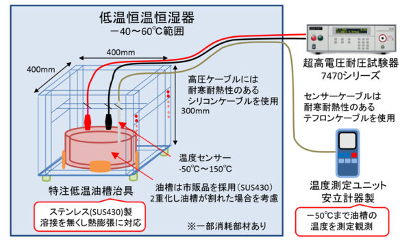 恒温槽内で使用する油槽治具において冷凍温度以下から室温などの温度サイクル試験をした場合、熱膨張が発生し油槽治具を破損してしまう可能性があります。弊社特注低温油槽治具は本問題点を考慮し、ACまたはDC20kV出力可能な耐電圧試験器と-50℃まで測定可能な温度測定器とあわせたシステムとして、低温時(冷凍温度下)の絶縁耐力試験環境を構築することが可能です。