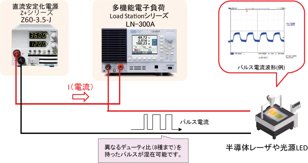 半導体レーザ(LD)や光源用LEDの駆動には、パルス電流(矩形波)による制御が必要となります。特に半導体レーザでは、μsオーダーの電流パルスを発生させる専用の駆動電源が必要でした。電子負荷LoadStationシリーズは、1μsの電流パルス幅を汎用電源との組合せで再現することが可能です。