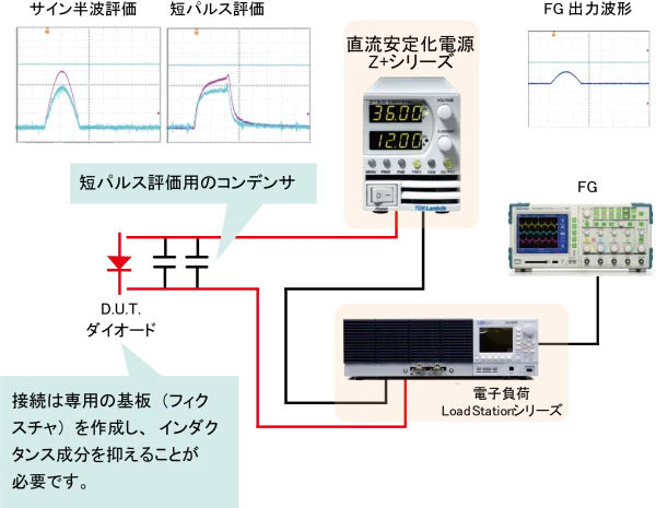 このアプリでは、汎用の直流電源、電子負荷等を使った半導体直流パラメータの簡易的な測定方法についてご紹介します。直流電源と電子負荷により駆動電流を急峻に変化させる試験(短パルス評価)、さらにFG(ファンクションジェネレータ)により電子負荷を制御し、サイン波形での試験(サイン半波評価)を行うことができます。