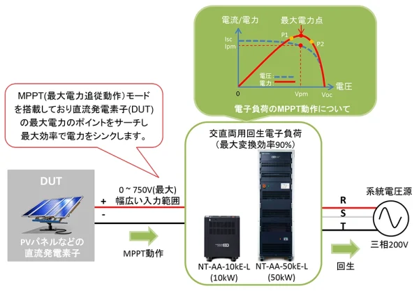 PVパネルからの直流発電を変換するには、パワーコンディショナー(PCS)が必要です。PCSは、PV用やFC用などの専用器具であり、入力範囲や定格電力が決まっています。交直両用回生電子負荷は、MPPTと系統連系規定に準拠しており、交流発電機器の系統連系に利用可能です。