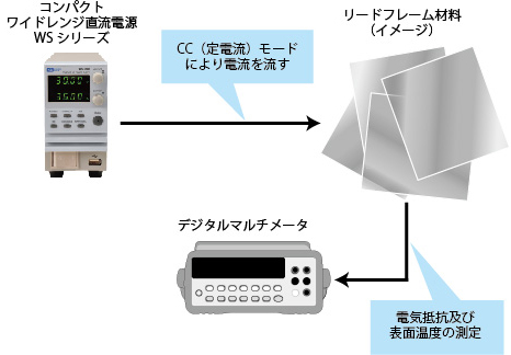 半導体などの様々なデバイスに使用されるリードフレーム材料の評価をする際、直流電源を使って電流を流し、電気抵抗や温度変化の測定が必要となります。このような場合、コンパクトワイドレンジ直流電源WSシリーズを使用すれば比較的ローコストに実現することができます。