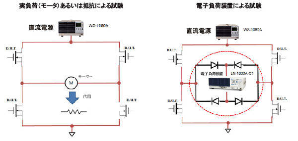 自動車用モーター駆動回路に採用されているHブリッジ回路の評価や検査を行う際、実際のモーターを使ったり、抵抗で代用することは可能ですが、電流値を容易に変更出来ないことから様々な条件での試験には適していません。このような場合、高速応答可能な電子負荷装置を使用することにより様々な条件での試験を容易に行うことができます。