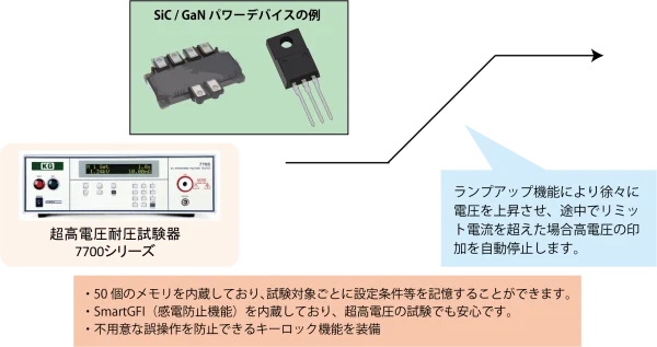このアプリでは、ポストSiのパワー半導体としてますます高耐圧化が進んでいるSiC(シリコンカーバイト)とGaN(窒化ガリウム)の耐電圧試験に最適な10kV及び20kVの耐電圧試験器7700シリーズをご紹介します。