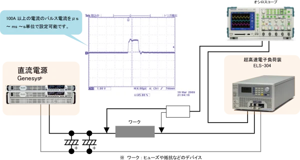直流電源の出力を高速大電流電子負荷により電流制御することで、大電流パルスを利用した パワーデバイスのONステート試験が可能となります。汎用の低価格な直流電源と高速電子負荷を組み合わせることで、比較的低価格で大電流パルスを生成することが可能です。
