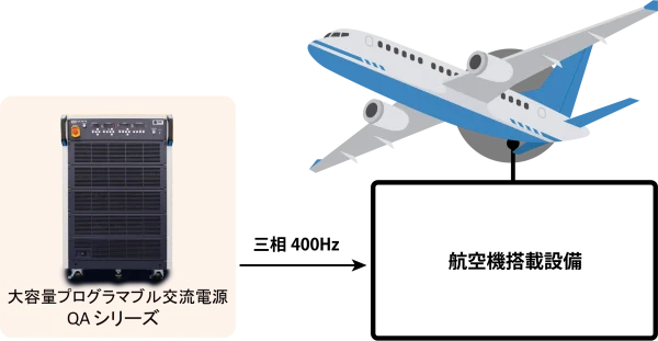 航空機や船舶に搭載される設備は一般的な地上の電源(日本国内では、AC100V-50Hz または60Hz)と異なり、電源周波数は400Hz となっています。従って、このような設備をメンテナンス等のために地上で動作・試験するためには400Hz を出力可能な交流電源が必要となります。