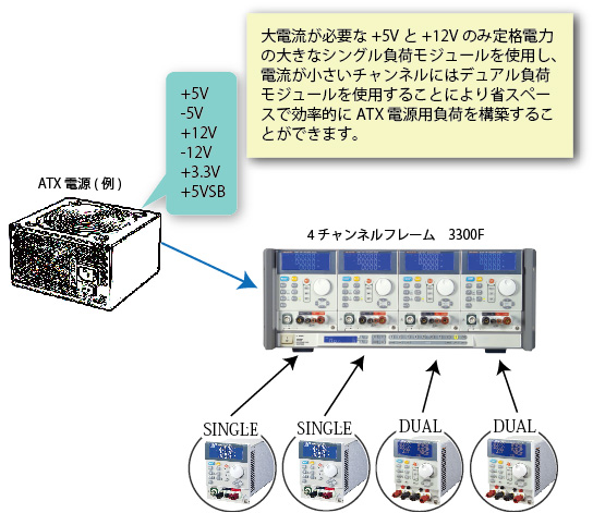 プラグインタイプの電子負荷装置でデュアルチャンネル負荷モジュールを使うことにより、簡単に6チャンネルの負荷装置を構築することが可能になるため、ATX電源の負荷変動試験を容易に行うことができます。