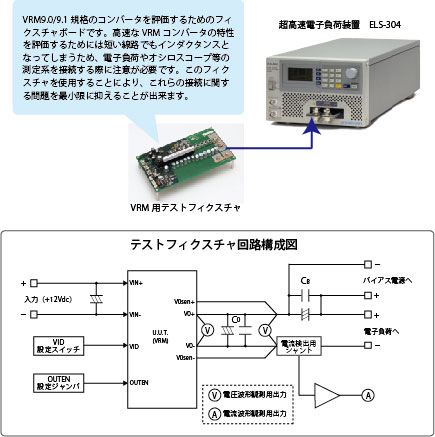 CPUボードなどに搭載されているVRMコンバータの評価には、高速電子負荷装置及びVRMに対応した専用のフィクスチャ(治具)が必要となります。このアプリでは、超高速電子負荷装置ELS-304を使ったVRMコンバータの試験構成例をご紹介します。