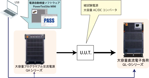 大容量のスイッチング電源(AC/DCコンバータ)を試験するためには、大容量の交流電源と大容量の直流電子負荷装置が必要となります。このアプリでは、これらの機器を自動検査ソフトウエアPowerTestSiteMINIによりコントロールし自動検査システムを構築した例をご紹介します。