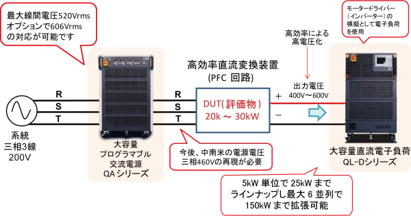 さらなる高効率化の為、空調用インバータ駆動用の直流電圧は高電圧化しており、前段の直流変換装置の評価には、高電圧化に対応した電子負荷装置が必要となります。