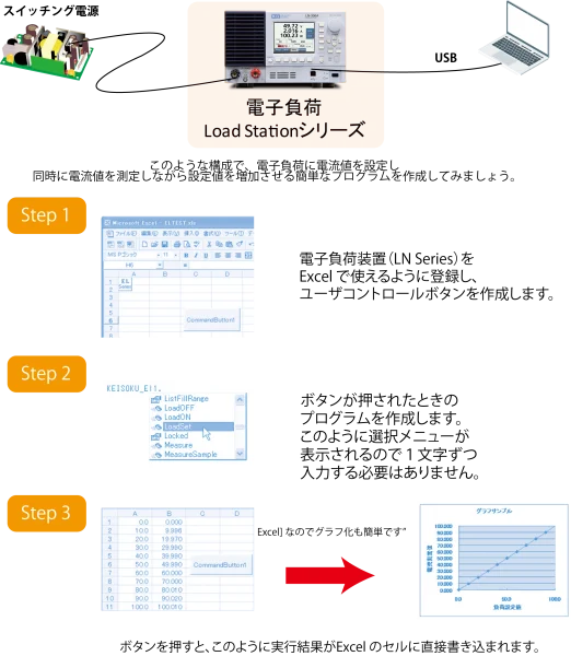 Microsoft 社のExcelは表計算ソフトウェアとして広く普及しています。このExcelにはマクロ (プログラム)開発環境としてVisual Basicが組み込まれており、計測器をコントロールする自動計測プログラムを比較的容易に作成することができます。また、Excel のワークシート上で作成できるため、測定結果をセルに取り込んでグラフ化するのも簡単です。