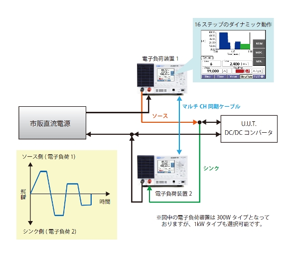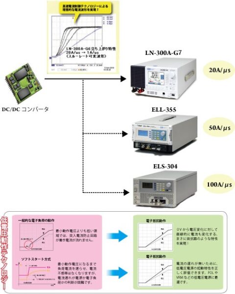 近年の携帯電話、スマートフォンや電子書籍端末など、モバイル端末に内蔵されたRFパワーアンプ用昇降圧DC/DCコンバーターICは、低電圧化(動作電圧:1V以下)及び高速化(動作周波数:数MHz 以上)しており、その負荷特性を評価するためには低電圧動作、高速応答の電子負荷装置が必要となります。