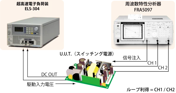 高速電子負荷と周波数特性分析器により、スイッチング電源のループゲイン特性を高精度に測定することが可能となりました。電子負荷装置と周波数特性分析器の2台だけで測定が可能となっており、この他にPC等は不要です。