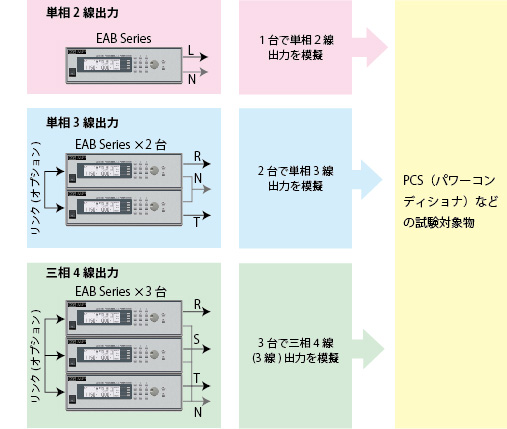 系統模擬に使用される交流電源はリニア方式が多く使用されていますが、リニア方式の場合、大型で重くなりコスト的にも割高となるのが一般的です。これに対して当社EABシリーズ交流電源はPWM方式となっており、リニア方式と比較して小型・軽量となっており、逆電流保護回路を内蔵しております。