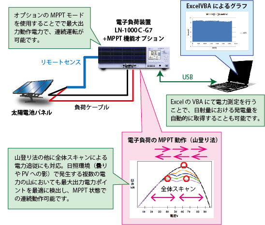 太陽電池の暴露試験を行う際、市販PCS(パワーコンディショナ)では動作条件を任意に設定することができないため、試験用途には適していません。このような場合、MPPT機能を搭載した電子負荷を使えば各種設定項目(スキャン時間や山登り法の電力ステップなど)を任意に設定できますので、より効率的に試験を行うことができます。