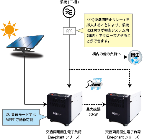 当社ではPCSの持つMPPT機能を電子負荷にオプションとして内蔵可能となっており、これにより様々なメーカー・仕様のPVパネルの性能比較を、1台の電子負荷を使って行うことが可能となります。