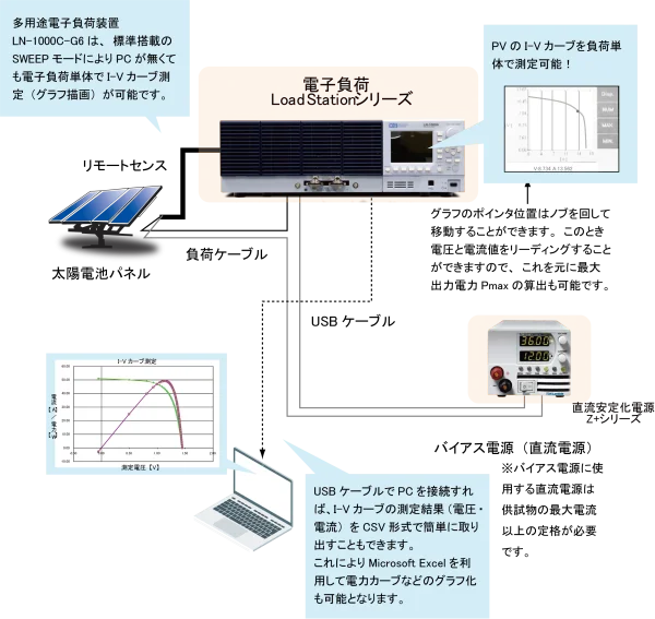 従来、太陽電池(PV)のI-Vカーブ測定には専用のI-Vカーブトレーサが必要でしたが、スイープモード搭載の電子負荷装置を使えば負荷装置単体でI-Vカーブの測定が可能となります。定電流スイープモードによりI-VカーブをPCや専用のソフトウェアなしで測定することが可能であり、大容量電子負荷装置を使えば大出力のPV試験も可能です。