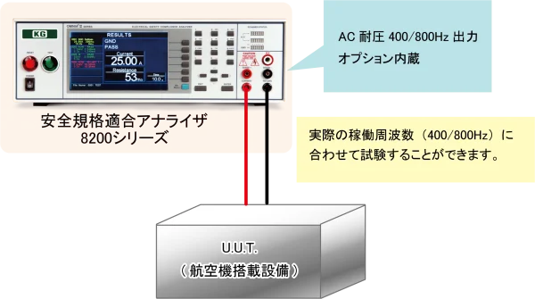 航空機に搭載される電源は地上の商用電源(50/60Hz)とは異なる周波数(400/800Hz)で動作します。従ってこれらの機器のAC耐電圧試験を行う際、厳密には実際の稼働周波数で行う必要があります。当社の安全規格適合アナライザESAシリーズは、オプションで400Hz(800Hz)出力を選択することが可能となっており、航空機搭載設備の試験にも問題なく使用することができます。