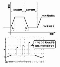 当社の電子負荷装置は右図のようにHIGH側の電流値とLOW 側の電流値、及びそれぞれの時間を合わせて設定することができます。また、応答時間(立ち上がり:Tr, 立ち下がり:Tf)もそれぞれ独立して設定することが出来ますので、非常にフレキシブルな設定が可能です。さらに、シーケンス機能を使用すると内蔵メモリに記録した波形により様々な充電電流のシミュレーションも可能です。