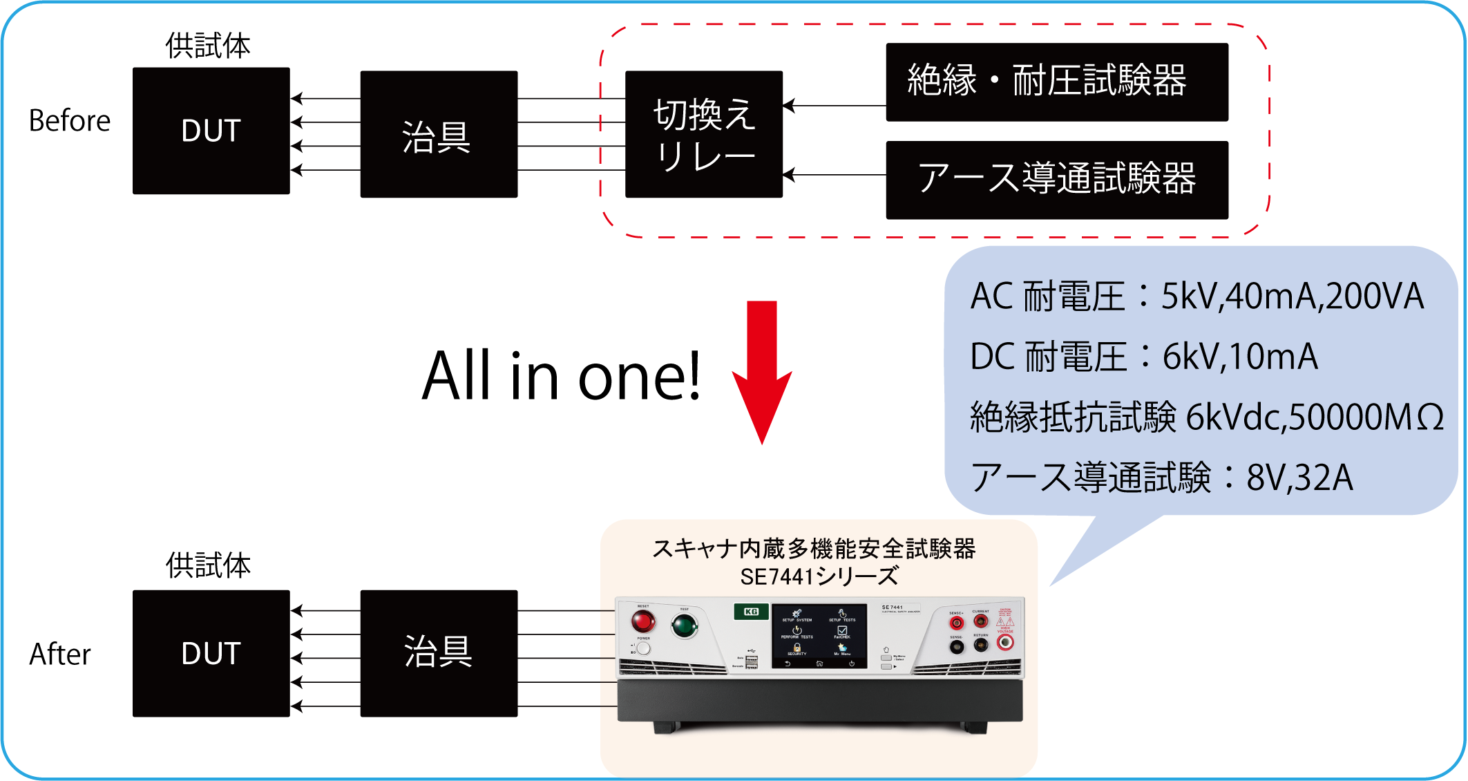 多機能安全試験器SE7441は、一般的な安全試験に必要な「AC耐電圧・DC耐電圧・絶縁抵抗・アース導通試験」の4種類の試験機能を全て内蔵しており、「オールインワン安全試験」が可能です。さらに、内蔵スキャナによりパソコンを使用せずに安全試験器単体で自動化することもできますので切り替え機などを作成する必要がなく、コストと手間を省くことができます。