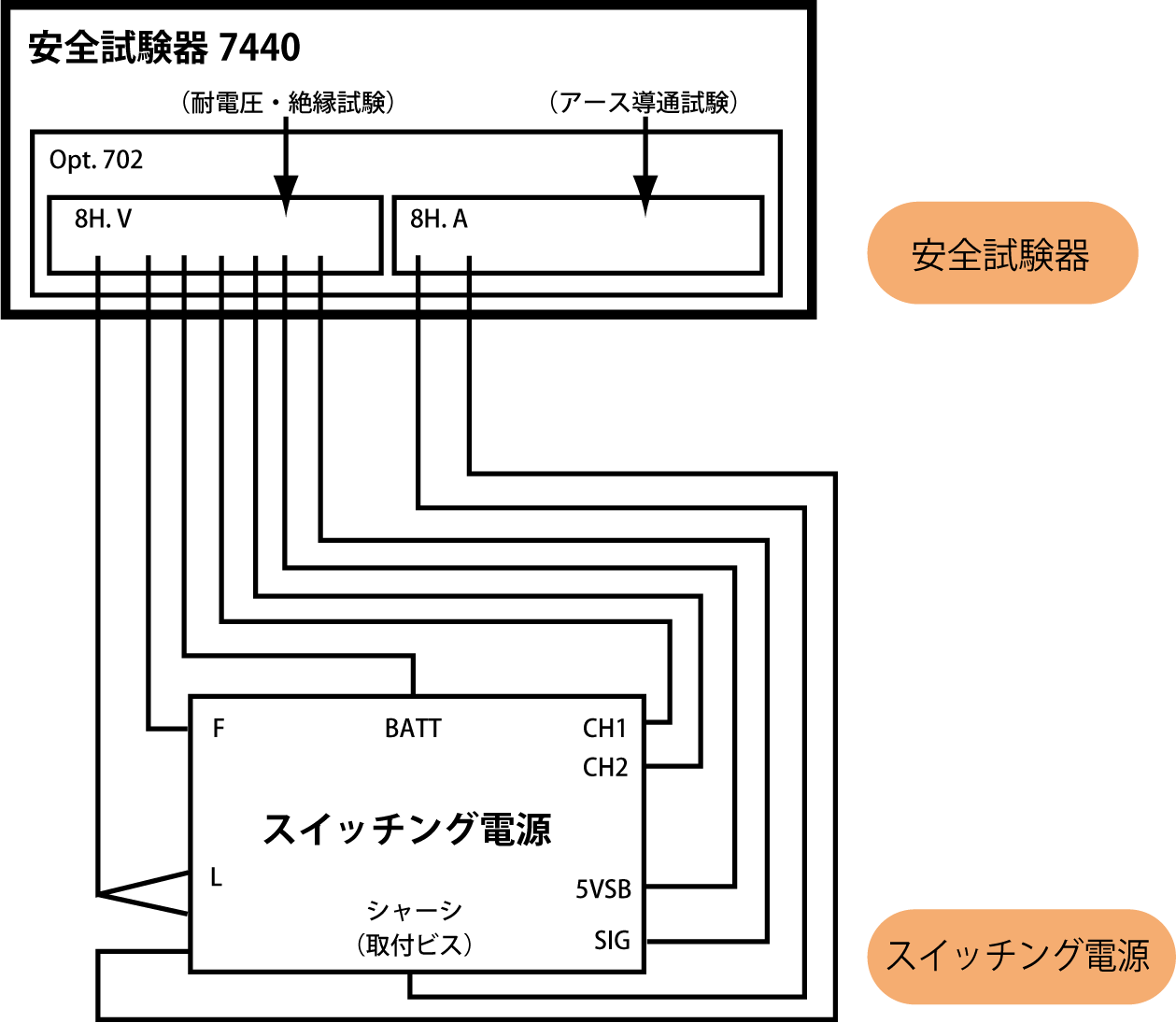 多出力(多機能)のスイッチング電源を手作業で安全試験を行う場合、接続の切り替えに手間がかかるため試験に時間がかかりますが、安全試験器SE7441は内蔵スキャナを標準装備しておりますので容易に自動化することができます。 左図のように高電圧切り替え(8H.V-CH1~8)及び高電流切り替え(8H.A-G, CH1~8)により全てのテストポイントを自動で試験することが可能です。
