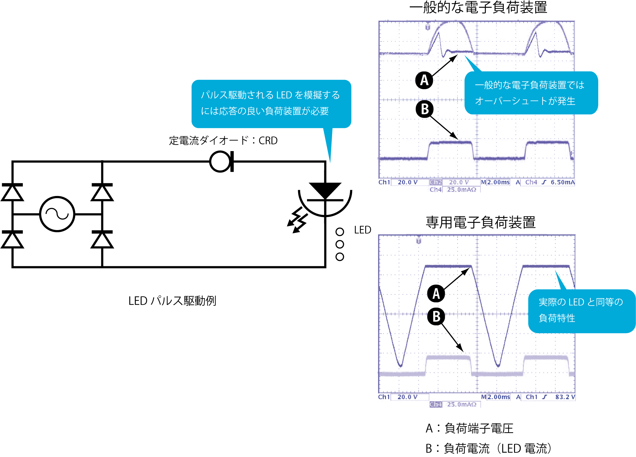 LED 照明用電源の評価検査には、LEDのVf特性を模擬する負荷装置が必要です。従来の電子負荷装置による定電圧負荷モードの模擬では応答が遅いため、LEDの特性の模擬ができませんでした。LEDエミュレータLE-5150は高速CV+CRモード及びリアルLEDモードによりLEDの動作特性を忠実に再現し、定量的な評価が可能です。