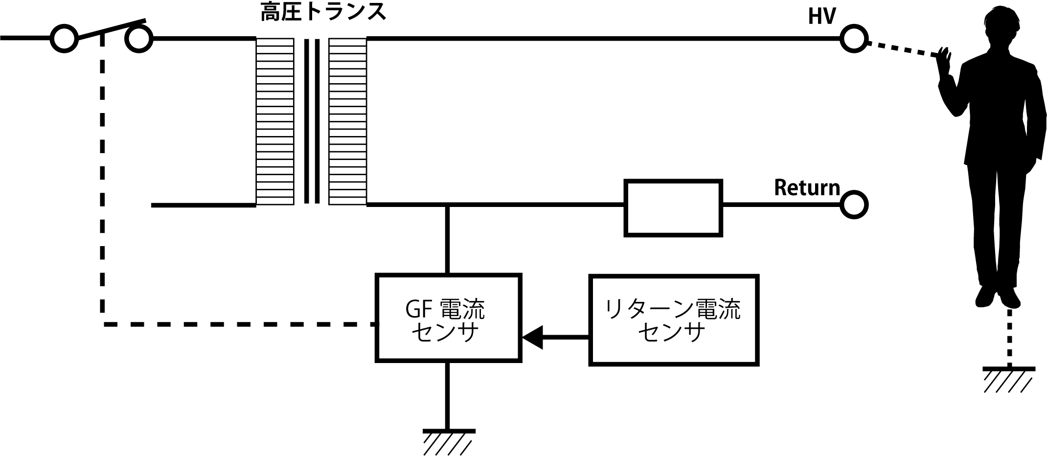 弊社の安全試験器はこのような危険から作業者を保護するため、スマートGFIという機能を持っています。試験中に被試験物のアースからグラウンドに対して余分な電流が450μA以上流れるとスマートGFI回路がこれを検出し、作業者の安全確保のために速やかに高圧を遮断します。