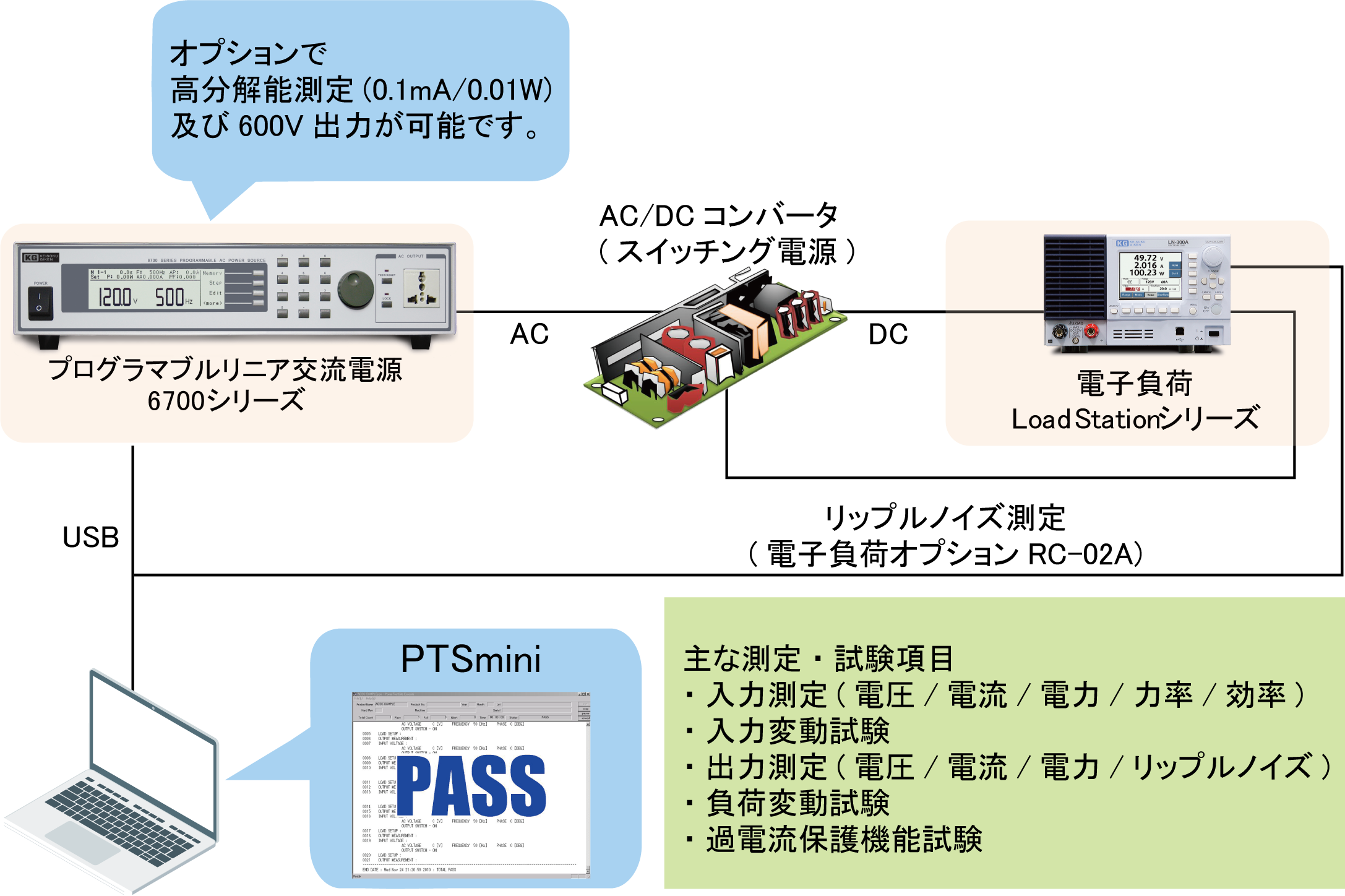 電源自動検査ソフトウエアPTSminiによる1CH 出力AC/DCコンバータ検査システムの基本的な構成例をご紹介します。AC入力にはリニア方式プログラマブル交流電源、DC出力にはリップルノイズ測定機能を内蔵可能なハイエンド多機能電子負荷装置を使用することによりAC/DCコンバータの入出力静特性試験を容易に行うことが可能となります。
