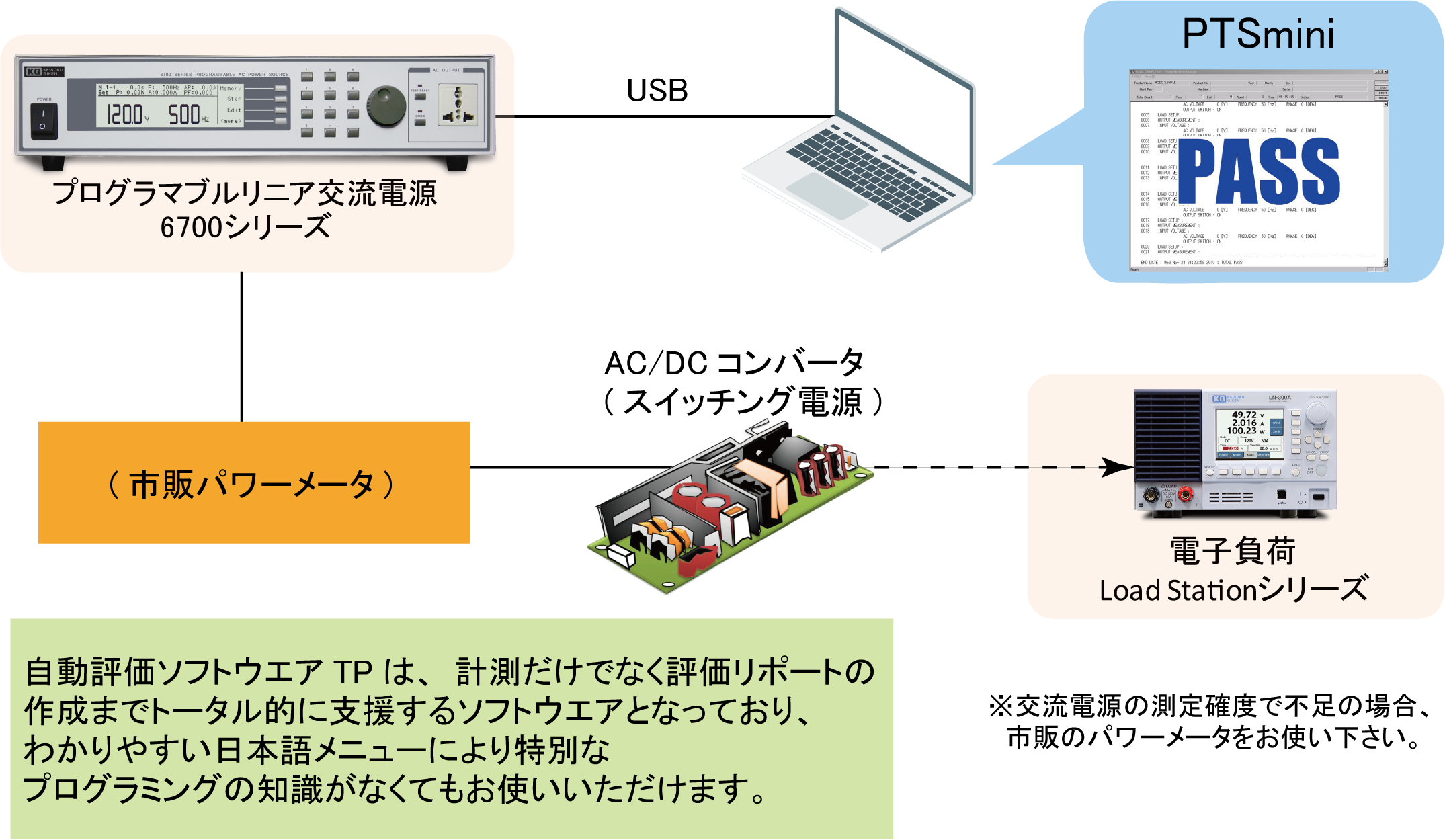 一般的に、交流電源に内蔵されている測定機能は高精度ではないため、外部に電力測定器(パワーメータ)が必要となります。しかし、当社交流電源6705に高分解能測定オプションを追加すると、交流電源単体で小電力測定も可能になります。また、自動評価ソフトウエアTPにより、EuP指令に対応した無負荷電力の評価を容易に自動化することが可能です。