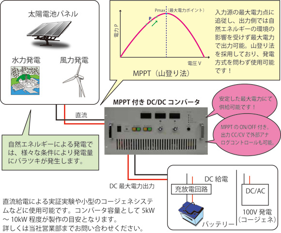 これにより、パワーコンディショナーではできない、直流給電などのDC電源ラインへ最大電力で供給することができ、将来にむけたDC給電の実証実験や小型のコージェネレーションシステムへの応用が可能です。