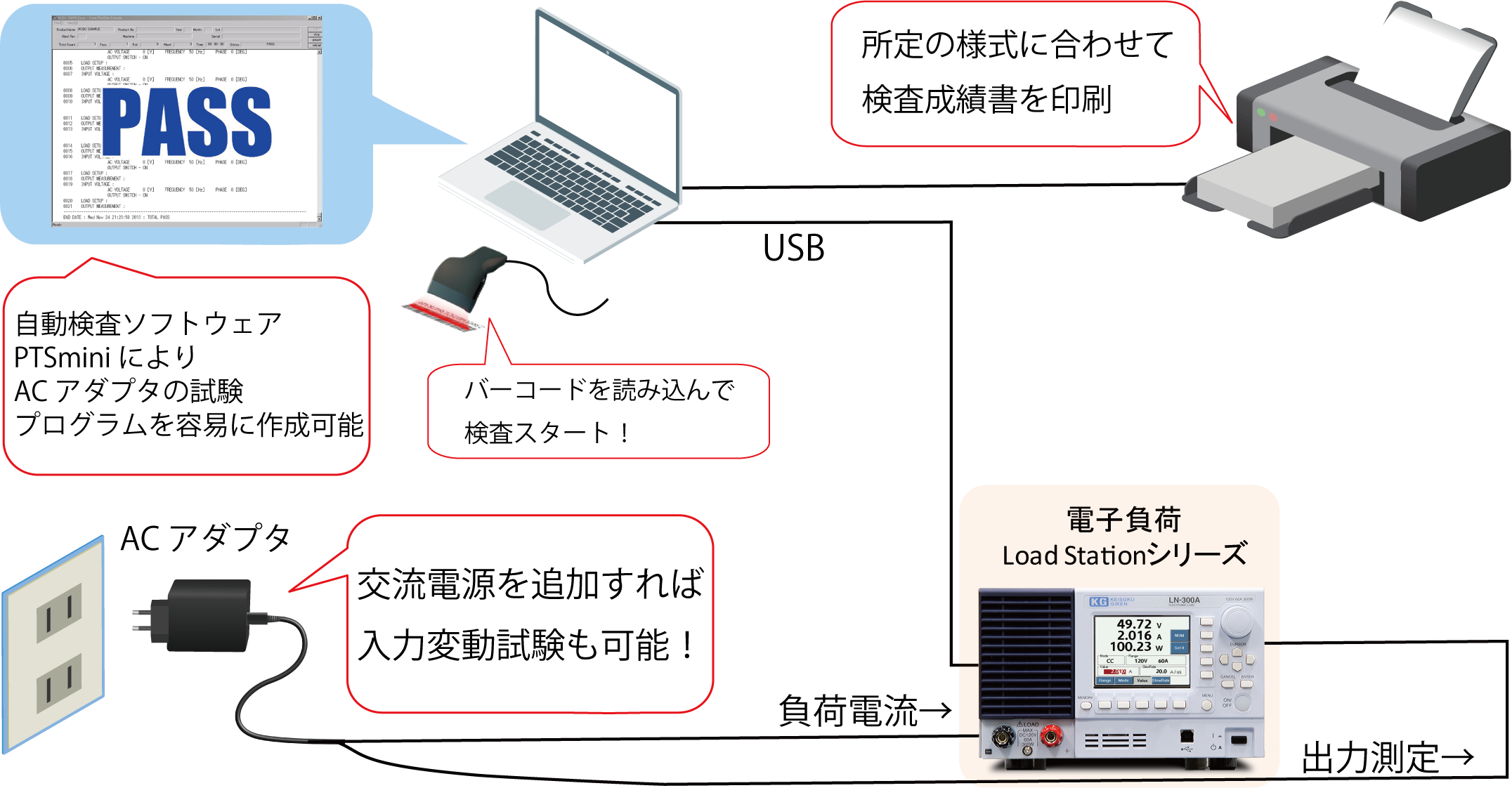 ACアダプタは携帯電話をはじめとして様々な製品に使われており、機器に電源を供給したりバッテリーに充電するという重要な役割を担っています。従って、ACアダプタの故障はその機器が全く使えなくなるという致命的な障害となるのは言うまでもありません。 このアプリでは、ACアダプタの出荷検査あるいは海外工場などで生産されたACアダプタの受け入れ検査などで使用できるローコストな試験構成例をご紹介します。