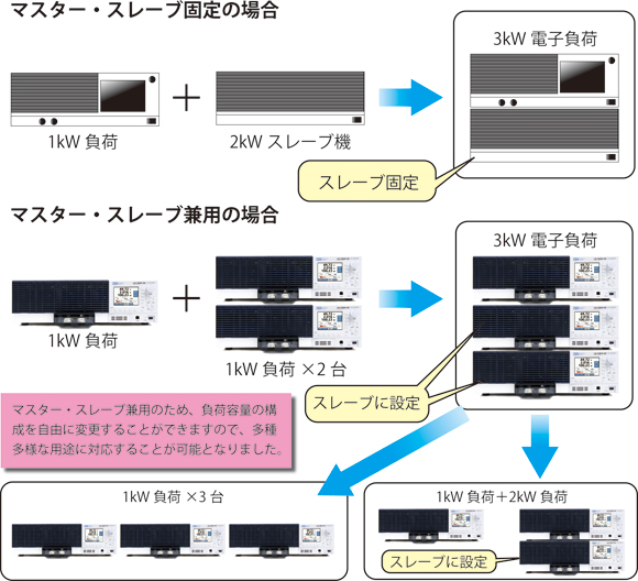 電子負荷装置の容量を増やす場合、ブースタ接続(マスター・スレーブ動作)による方法が広く使われていますが、一般的なブースタ接続の場合、マスター及びスレーブ機は固定化されており、それによって負荷容量も決まります。これに対して当社の電子負荷装置(Load Stationシリーズなど)はマスター機、スレーブ機を何度でも自由に再設定出来るため様々な負荷容量への再構築が可能です。