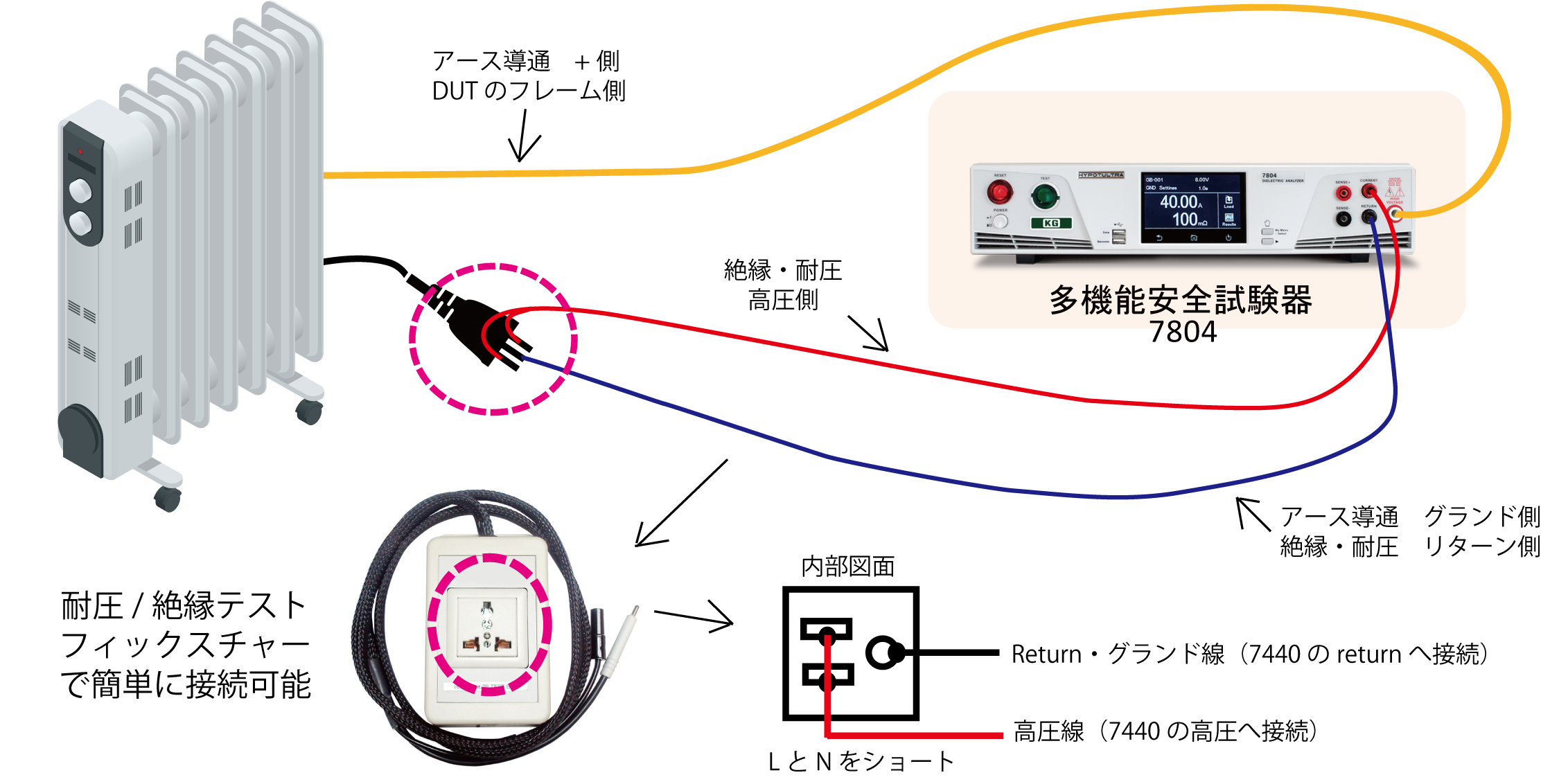 耐圧・絶縁試験とアース導通試験は別工程とするのが一般的ですが、7800多機能安全試験器とテストフィクスチャーを組み合わせれば、コンセントと製品間との耐圧・絶縁試験とアース導通試験を同じ工程で行うことが可能です。段取りが不要で完成品の試験工程を短縮することができます。