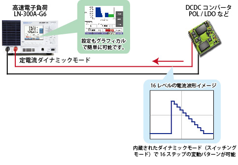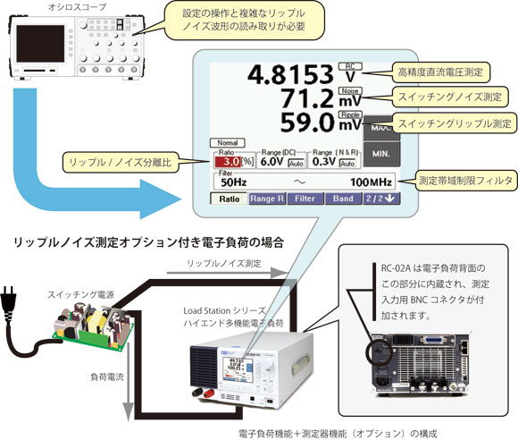 スイッチング電源の開発評価現場において、オシロスコープによりリップルとノイズを測定することは可能ですが、オシロスコープの時間軸(タイムベース)の設定変更など操作が必要となります。これに対して電子負荷のリップルノイズオプションをお使い頂くと以下の様にリップル値とノイズ値のデジタル値が同時に電子負荷画面に表示されますので、オシロスコープで波形観測や複雑な波形読み取りをしなくてもワンタッチで容易に測定値することができます。