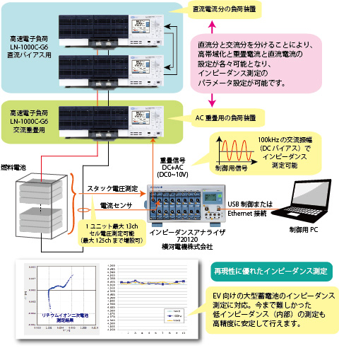 従来のインピーダンス測定はセルが中心であり発電電圧は低く、また重畳電流も小さいため直接アナライザへ入力しても問題ありませんでした。これに対してスタックの評価の場合、セルが直列となっているので電圧が高く高出力なため、負荷電流も増え大きな重畳電流が必要となります。このアプリでは、500V耐圧の高速電子負荷とインピーダンスアナライザにより100kHzまでのインピーダンス測定を行う例をご紹介します。