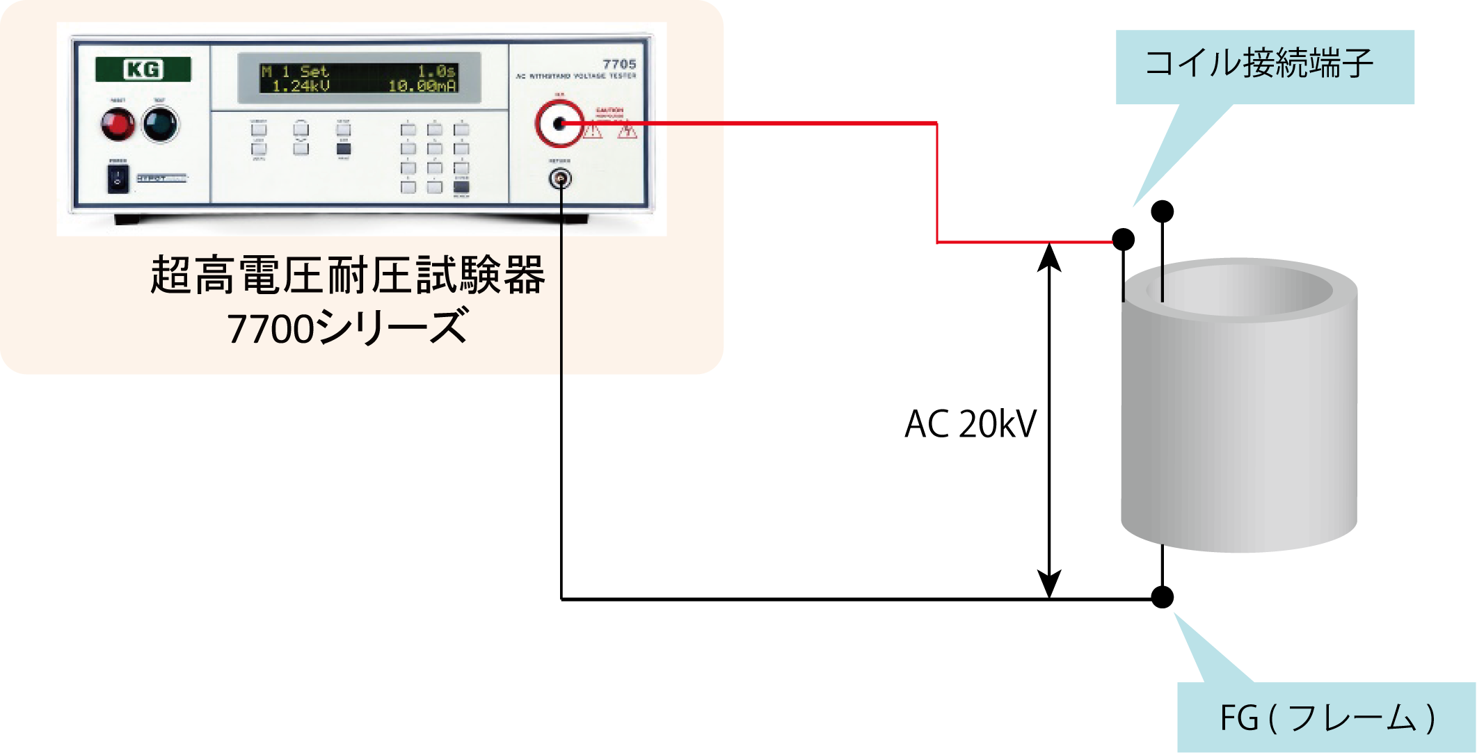 空調機などに組み込まれているモータ(コイル)の耐電圧試験は、交流20kVの高電圧による試験が必要な場合があります。一般的な耐電圧試験器は5kV前後となっていますが、当社の7700シリーズはAC20kVまで出力可能な機種があります。このアプリでは、空調機用モータに組み込まれているコイルのAC20kV耐電圧試験についてご紹介します。