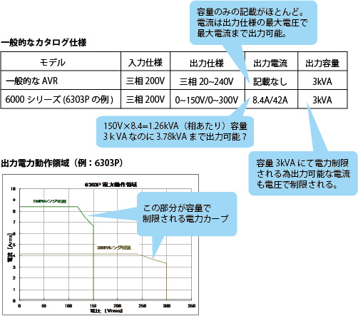 6000シリーズ交流電源は電圧レンジ150Vと300Vの2レンジを持っており、それぞれ出力可能な最大電流があります。しかし、容量(電力)制限される為、電圧レンジにおける最大電圧(150Vまたは300V)では最大電流の出力はできません。系統電圧源の模擬電圧源として、115V設定または230V設定で最大電流が流せるように設計されております。