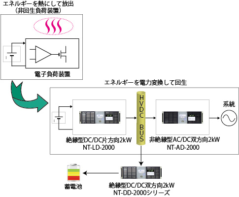 双方向電源NTシリーズのDC/DC片方向ユニット(NT-LD-2000E)とAC/DC双方向ユニット(NT-AD-2000)と組み合わせることで2kWの回生電子負荷装置を構築することができます。