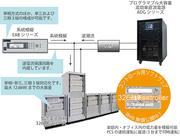 当社の交流電源EABシリーズはその構成により単相2線、単相3線及び三相3線出力が可能であり、逆電流保護回路を内蔵しております。また、交流電子負荷装置3260Aシリーズは最大で12.6kWまで対応可能であり、無償公開のソフトウエアを使うことにより電力変化の模擬をシーケンス動作で簡単に行うことができます。