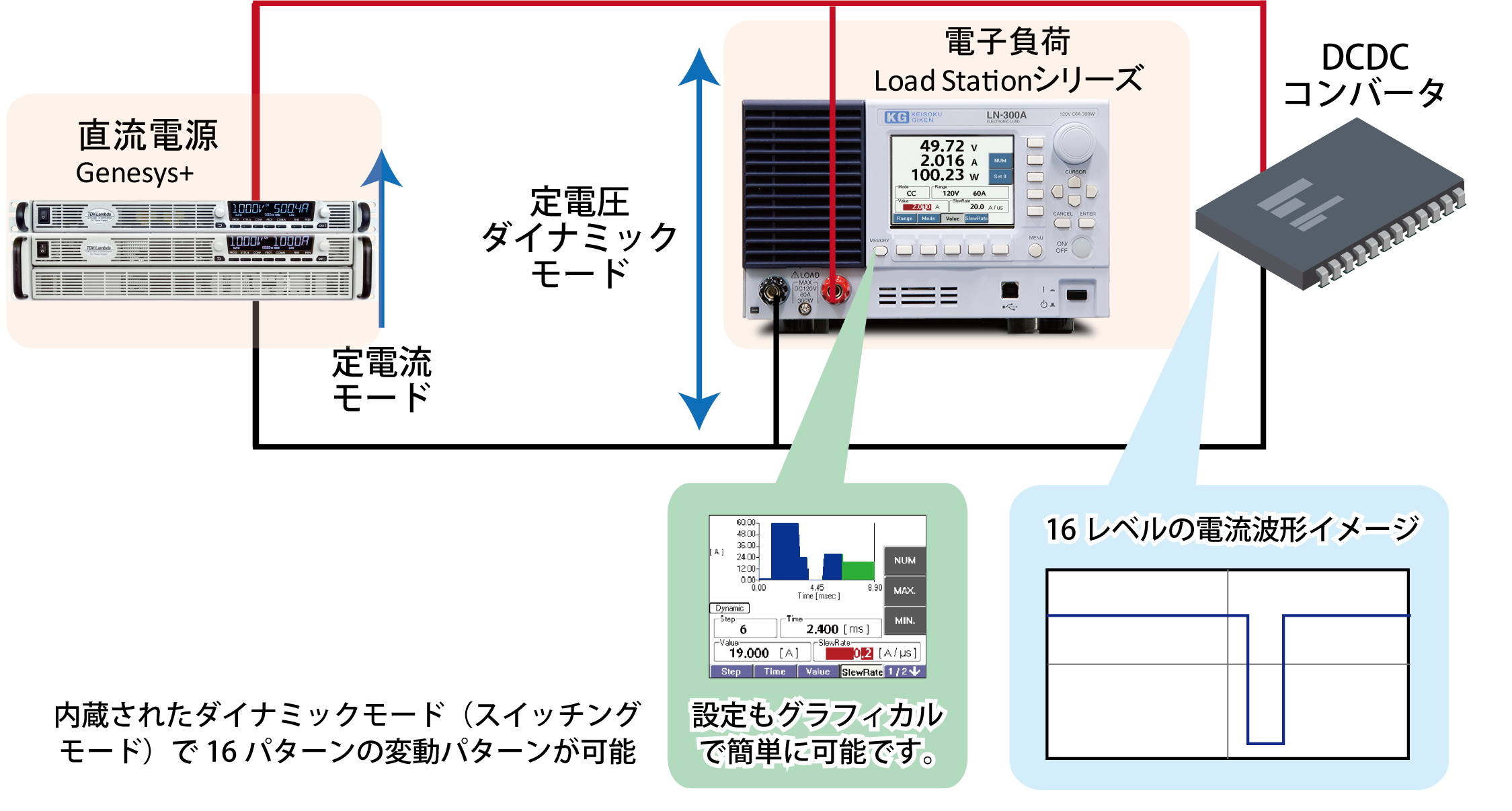 このアプリでは、汎用直流電源WSシリーズの出力に電子負荷装置LN-300Aを接続し、電子負荷装置の動作モードを定電圧でダイナミック(スイッチング)動作させて電源変動試験を実現する例をご紹介します。
