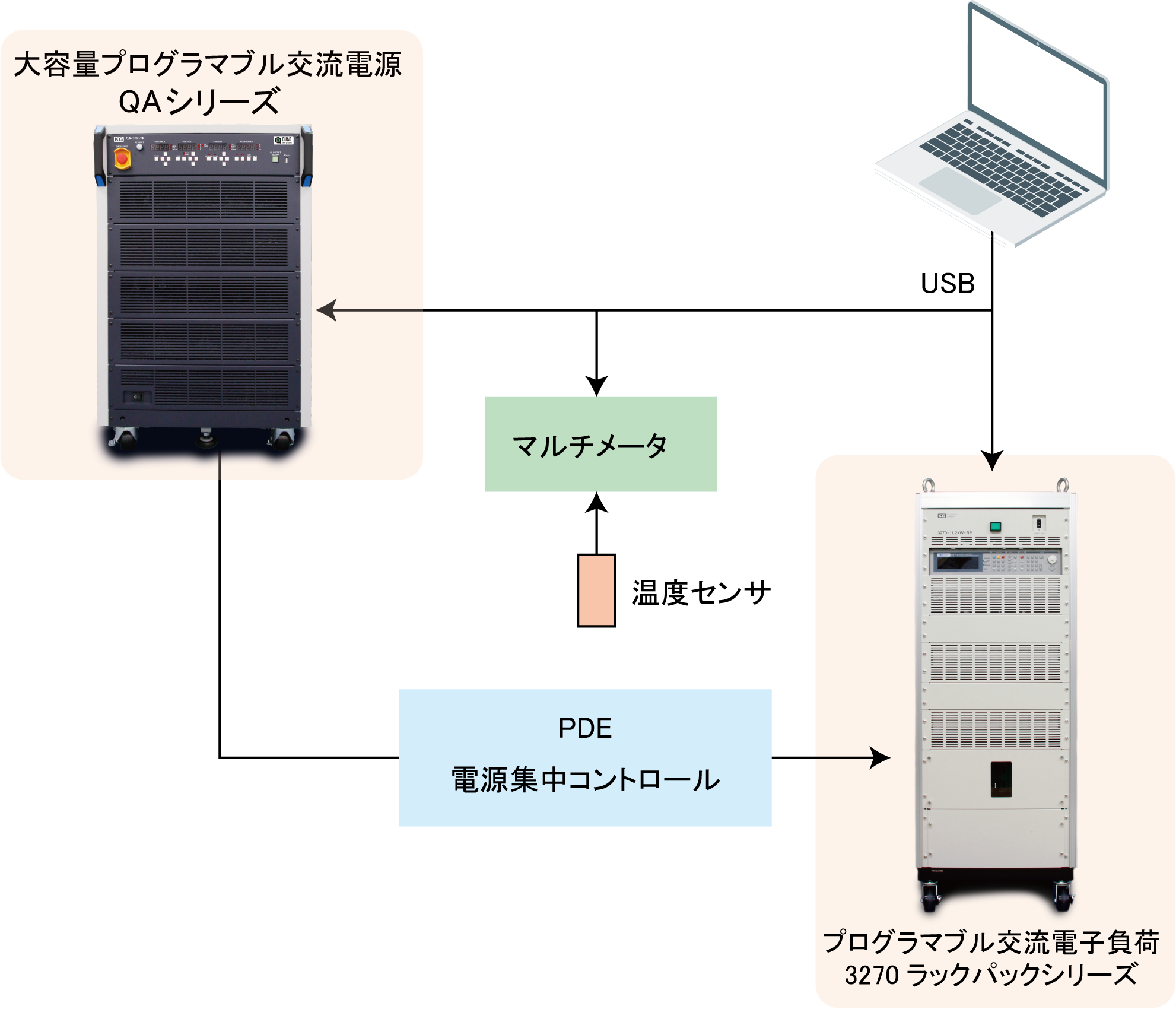このアプリでは、交流給電ラインに使われるPDE(電源集中コントロール)のオーバーロード(過負荷)状態を交流電子負荷装置によりつくり試験する例をご紹介します。従来はスライダックを用いて定格電流の100%から徐々に130%まで電流を増やしていく方法が一般的でしたが、交流電子負荷装置を用いれば一定の上昇間隔をキープして表示パネルで電流量を確認しながら試験することができます。