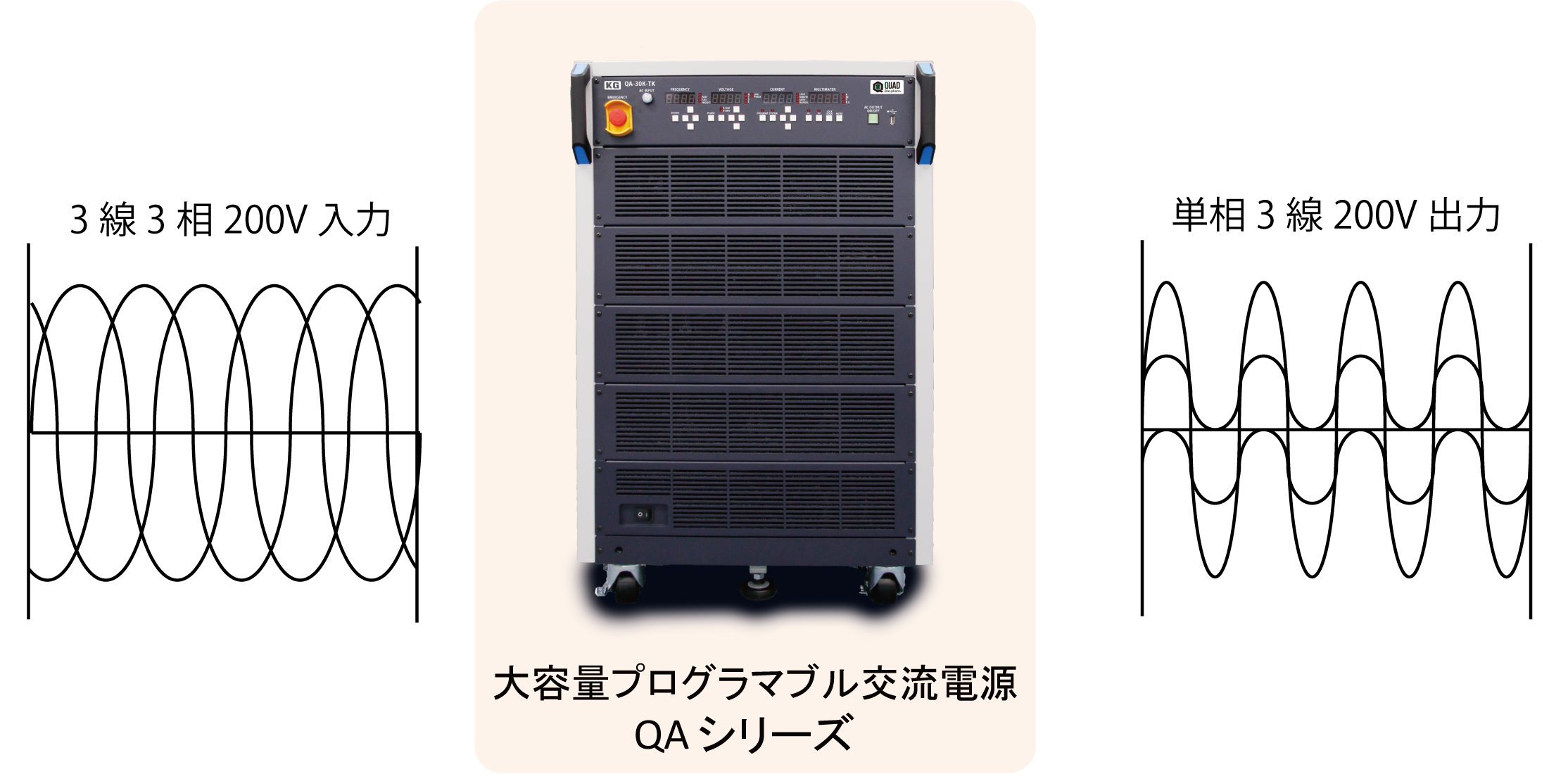 三相から単相3線への変換にはスコットトランスなどを使用する方法がありますが、各相がアンバランスな場合、力率や効率が低下することが知られています。当社の交流電源6300シリーズは、三相出力間の位相差120度を180度に変更する単相3線出力オプションが用意されているため、負荷がアンバランスの場合でも安定した単相3線出力が可能です。