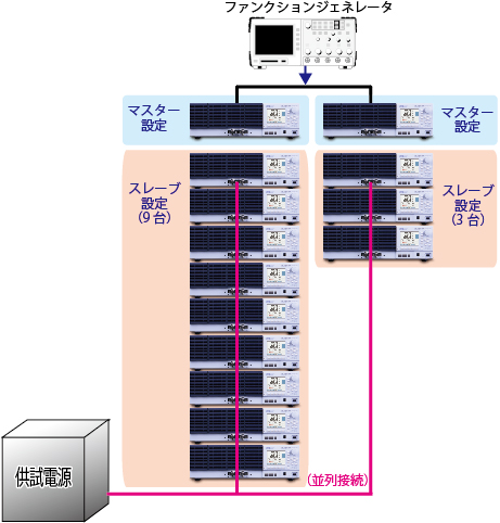 当社の電子負荷装置Load Stationシリーズのブースター機能は、最大10台(10kW)までの制限があります。このような場合、10台と4台に分割し、それぞれマスター/スレーブ接続し、マスター機をファンクションジェネレータ等から制御することにより、あたかも14kWの電子負荷装置としてお使いいただくことが可能です。