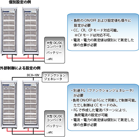 直流電子負荷はブースタ(マスタースレーブ)機能を持っていなくても並列動作をすることが可能です。このアプリでは、複数の電子負荷に個々に設定する方法と、電子負荷の外部制御入力を使ってファンクションジェネレータから設定する方法をご紹介します。