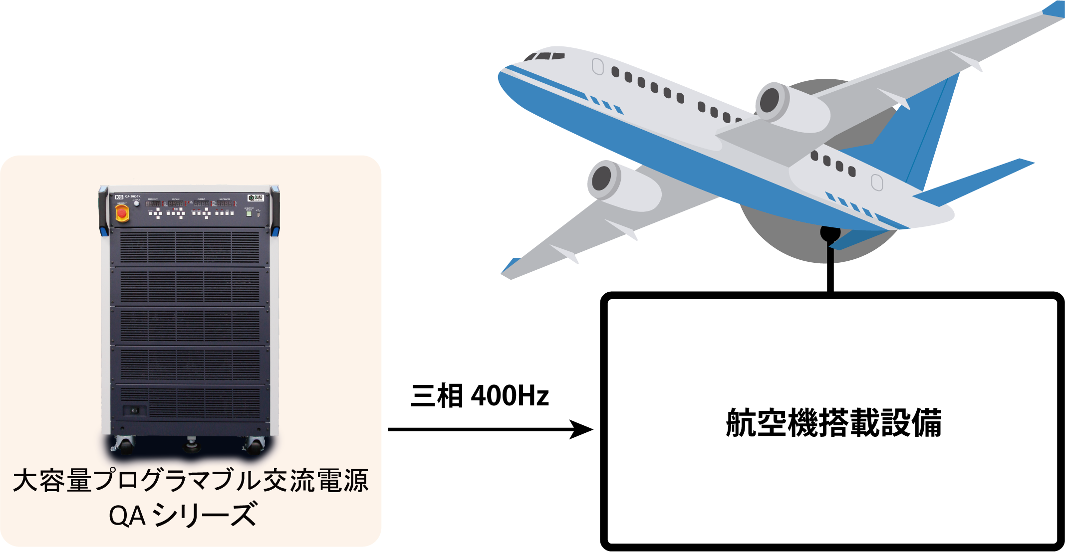 航空機や船舶に搭載される設備は一般的な地上の電源(日本国内では、AC100V-50Hz または60Hz)と異なり、電源周波数は400Hz となっています。従って、このような設備をメンテナンス等のために地上で動作・試験するためには400Hz を出力可能な交流電源が必要となります。