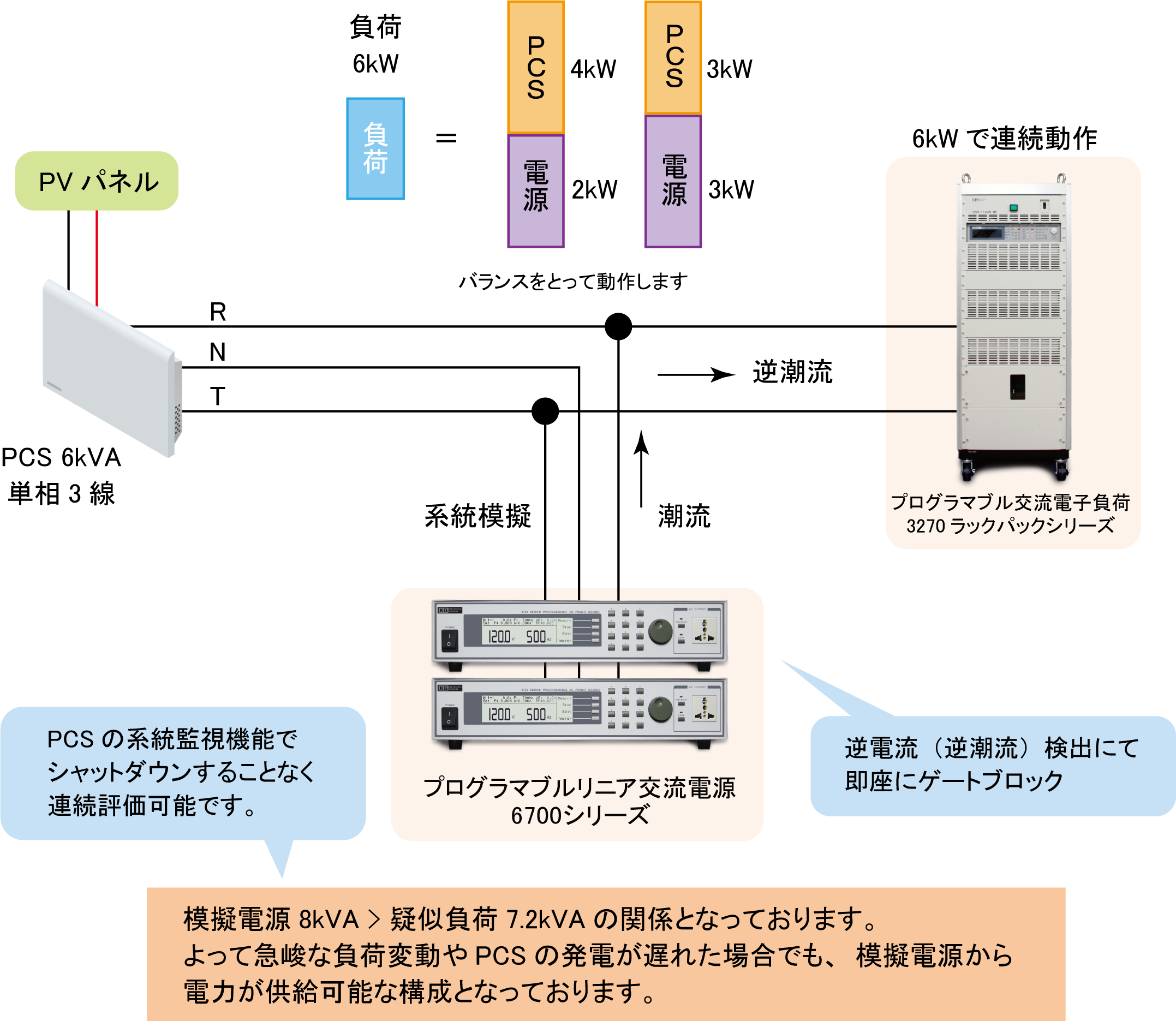 開発中のPCS(パワーコンディショナー)は、当然ながら認証を受ける前のため、系統に接続した運転試験を行うことは出来ません。このような場合、実際の系統から独立した系統、いわゆる「模擬系統」が必要となります。このアプリケーションでは、逆電流保護回路を内蔵した交流電源により模擬系統を構築した例をご紹介します。