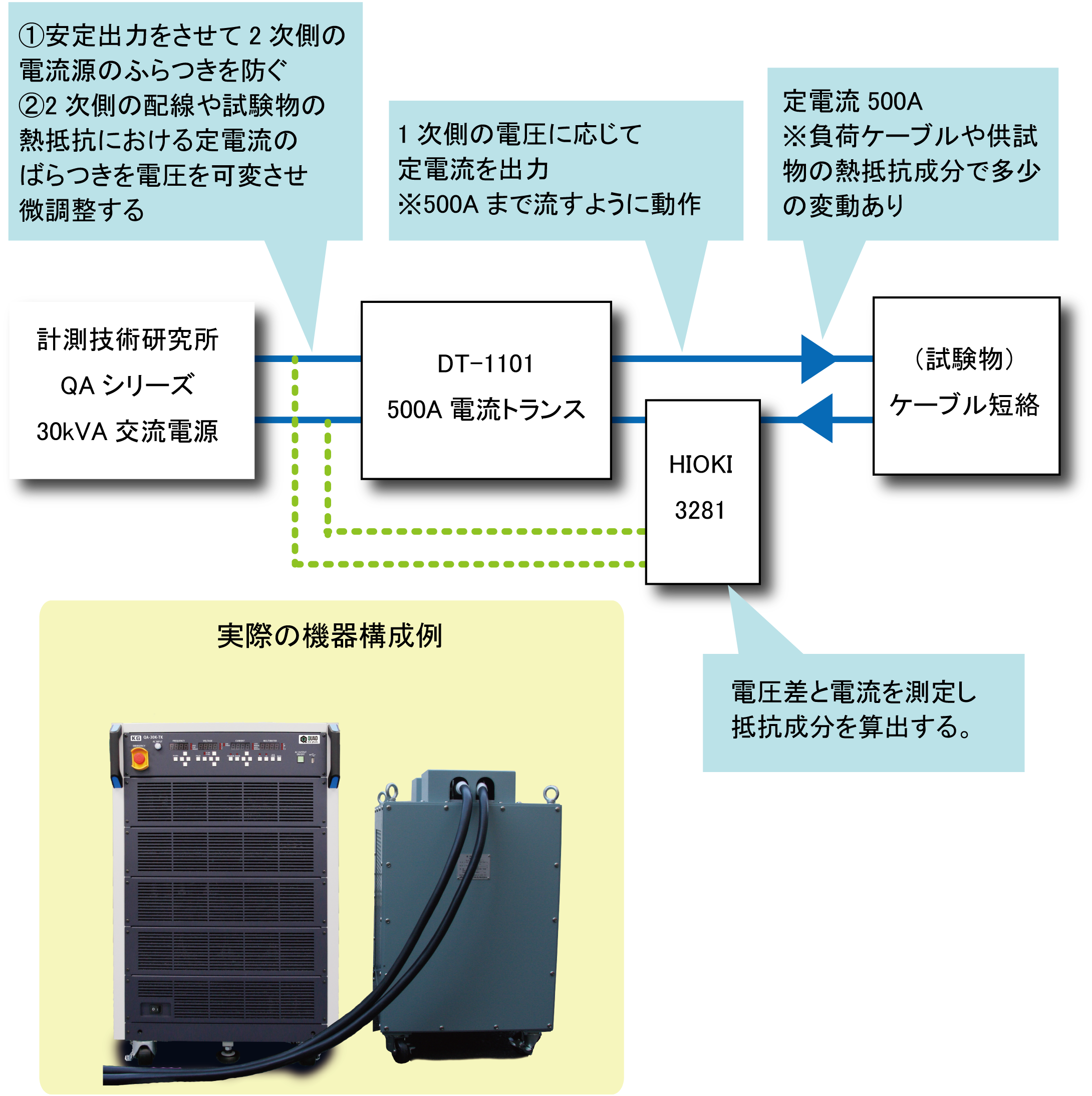 中国CCCでは、医用電気機器の安全規格GB9706.1では、実際の消費電流ではなくブレーカの遮断電流に対して1.5倍の電流によるアース導通試験が要求されています。このような場合、一般的なアース導通試験では最大電流が不足することがあります。そこで、以下のように定電圧交流電源と電流トランスの組み合わせにより大電流のアース導通試験を実現した例をご紹介します。